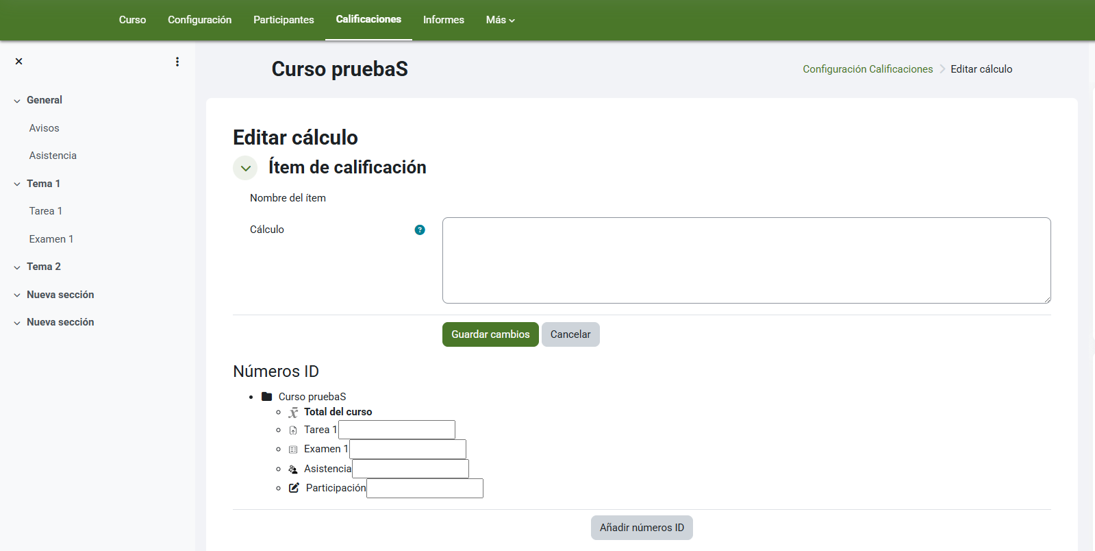 Una vez que hayamos asignado identificadores a los ítems y/o categorías (pulsando el botón Añadir números ID), podremos incluirlos en nuestra fórmula, encerrándolos entre dobles corchetes. Ej: [[examen]]