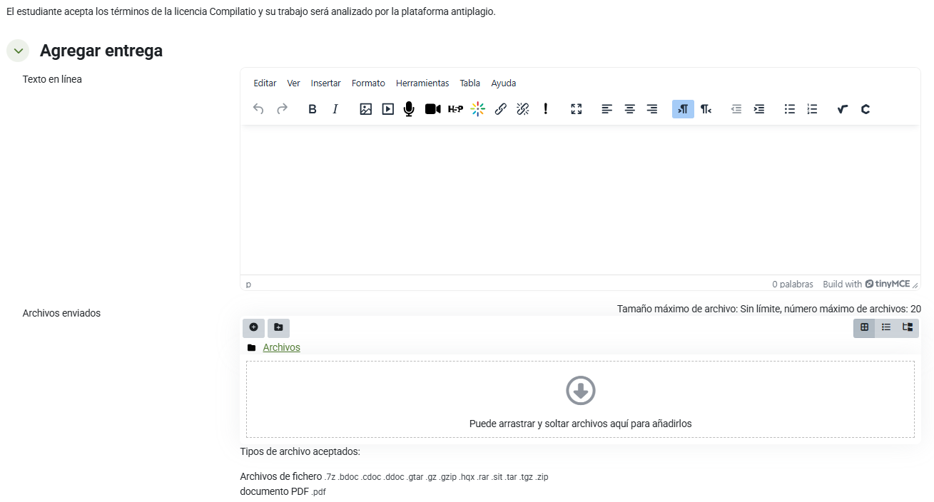 Importante: Si la tarea tiene activado el análisis de Compilatio, aparecerá un aviso en la zona superior indicando que tu trabajo va a ser sometido a un detector de plagio.