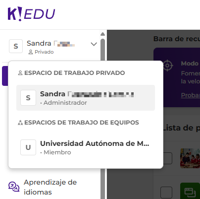 Si aun así no encontramos nuestro Kahoot, es posible que lo hayamos creado en nuestro equipo de trabajo privado, es decir, en nuestra cuenta. Para acceder a nuestras creaciones privadas, pulsaremos en el equipo de la UAM y cambiaremos al equipo donde se encuentre nuestro Kahoot.