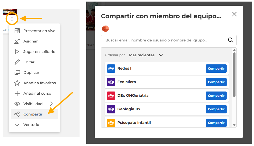 Si quieres que otros compañeros docentes vean un Kahoot que has creado o quieres que lo editen, puedes utilizar el menú Compartir o hacer uso de los Espacios de trabajo.