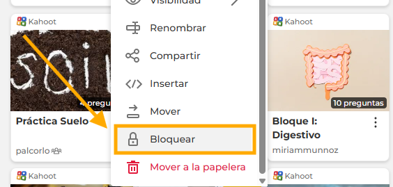 Ahora bien, si no queremos que otros docentes puedan modificar nuestro Kahoot una vez subido al Espacio común, debemos Bloquearlo pulsando en los tres puntos del Kahoot desde la vista de la Biblioteca. Esto evitará que otros modifiquen el original, pero sí que puedan duplicarlo para tener una versión propia editable.
