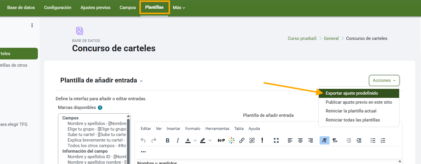 Una vez hayamos configurado los campos, podremos guardar el formulario de entrada como plantilla para utilizarla en las bases de datos de otros cursos. Para ello, entraremos en el menú de Plantillas y elegiremos Exportar ajuste predefinido en el desplegable.