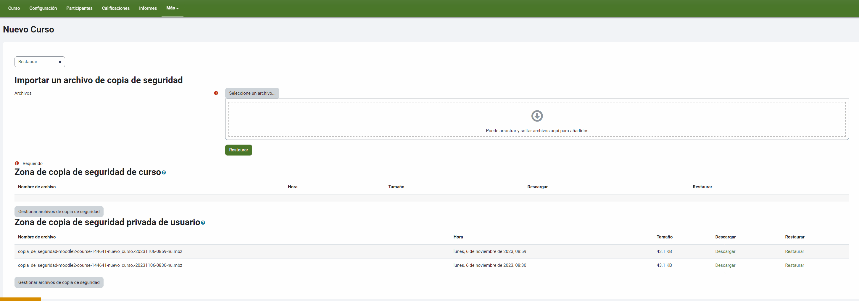 - Vuelve a la página de Moodle del curso actual (moodle.uam.es), entra en la asignatura correspondiente y restaura la copia de seguridad del curso anterior.