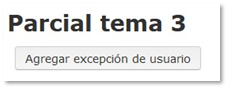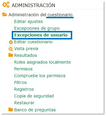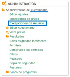 Hacemos clic en el nombre del cuestionario ya creado (no hace falta activar edición). Nos llevará a una página de resumen del cuestionario. Buscamos en el bloque de administración la opción excepciones de usuario.