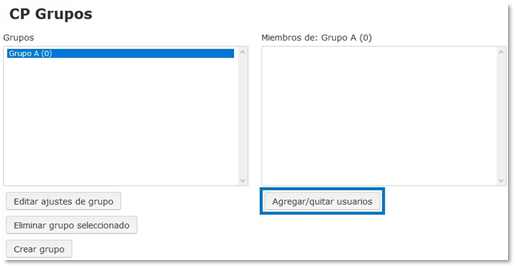 Volvemos a la página de gestión de grupos, en la que nos aparece el grupo creado. Con él seleccionado, hacemos clic en agregar/quitar usuarios.