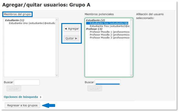 - Seleccionamos los estudiantes en la caja de la derecha y hacemos clic en agregar.