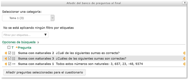 Se nos abre una ventana desde la que podemos importar las preguntas de nuestro banco. Para ello, seleccionamos la categoría desde la que queramos importarlas (Tema 1) y elegimos las preguntas.