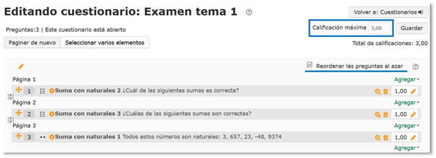 Por último, nuestra recomendación es que siempre actives la opción Reordenar las preguntas al azar, para que a cada estudiante le aparezcan en diferente orden.