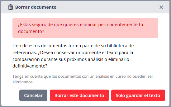 - Sólo guardar texto (si está activado como referencia): eliminaremos el archivo original y su ficha de análisis, pero mantendremos el texto extraído para guardarlo en la biblioteca de referencias.