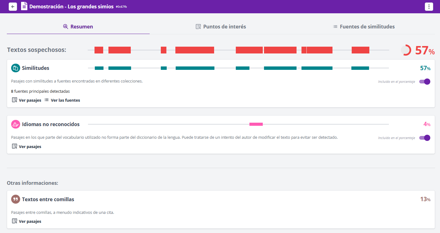 Desde aquí, podremos ver el porcentaje general de similitud y tres detecciones que hace Compilatio:
