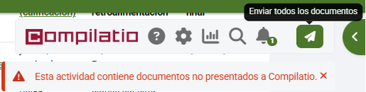 Tras esto, veremos que en el menú Entregas de la actividad nos aparece la barra de herramientas de Compilatio junto con un aviso que nos señala la existencia de archivos no escaneados. Para que los analice, deberemos pulsar en el botón de Enviar todos los documentos.