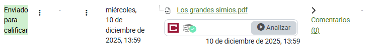 Si hemos activado el análisis manual, deberemos pulsar en Analizar dentro del menú de Entrega de la tarea para que se ponga en la cola de Compilatio. Después de eso, se nos abrirá una barra de herramientas encima de las calificaciones.