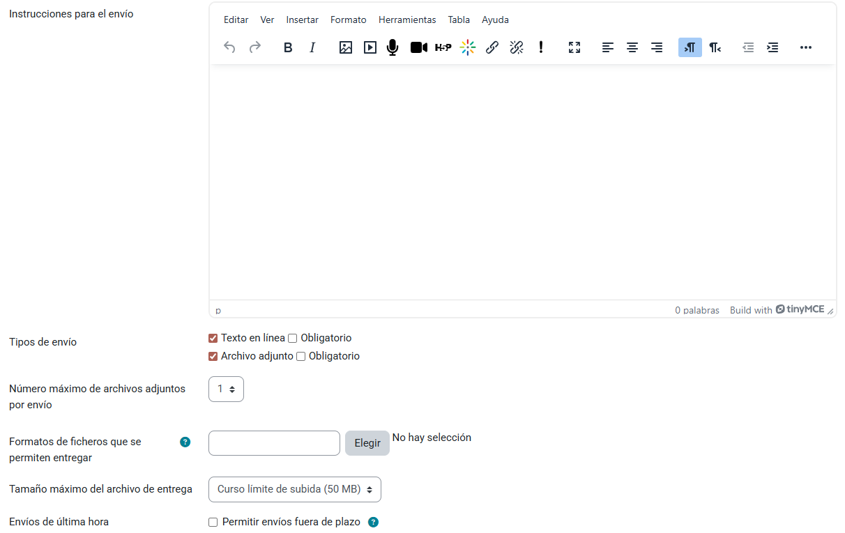Para que el alumnado realice la entrega satisfactoriamente, es recomendable proporcionar una descripción del trabajo a realizar en las instrucciones para el envío, sobre todo indicando los parámetros de entrega, que configuraremos también en este apartado.