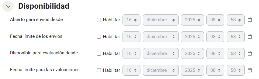 En esta última pestaña podremos configurar la temporalización del taller si así lo deseamos, activando fechas de inicio y cierre tanto de entregas como de la fase de evaluación.