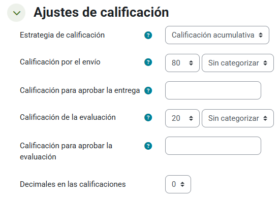De esta manera, vemos como debemos configurar la calificación mínima para aprobar, igual que en otras tareas, pero debemos elegir una para cada parte antes mencionada: nota mínima para aprobar la entrega y nota mínima para aprobar la evaluación.