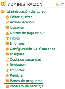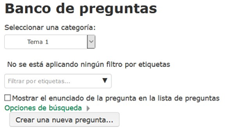 Hacemos clic en “banco de preguntas”, situado en el bloque “administración”. Llegamos al gestor de preguntas. Comenzamos seleccionando la categoría en la que queremos añadir preguntas.