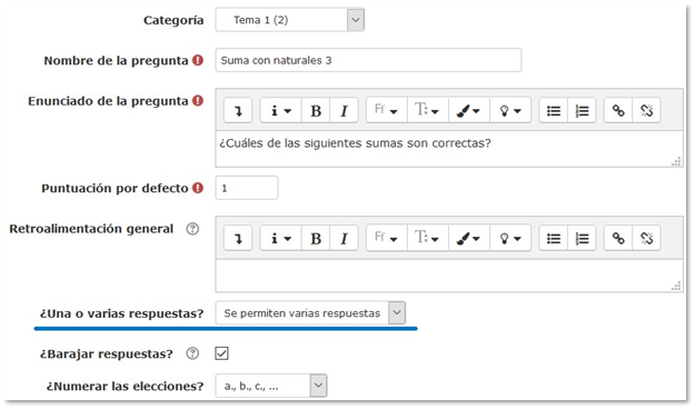 Escribimos el nombre de la pregunta y su enunciado, y cambiamos su puntuación si nos interesa. Asegúrate de que has seleccionado “se permiten varias respuestas” en la opción “una o varias respuestas”. Si marcamos “barajar respuestas”, las respuestas aparecerán desordenadas.