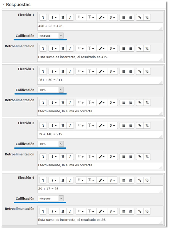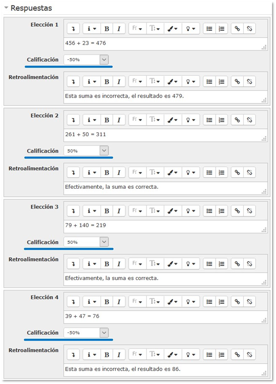 Si queremos que estas preguntas penalicen (es decir, que resten si se contestan mal), entonces tendremos que especificar un porcentaje negativo a la calificación. El ejemplo cambia:
