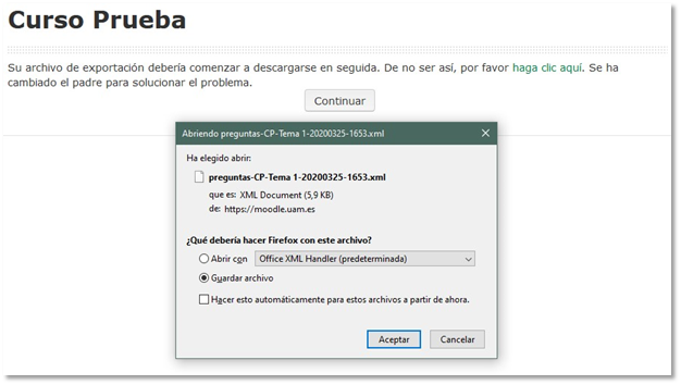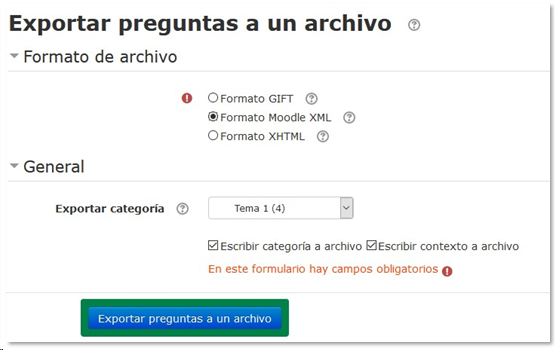 Para exportar, te recomendamos seleccionar el Formato Moodle XML. Selecciona también la categoría y pulsa el botón de exportación.