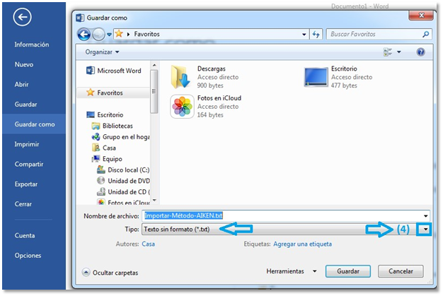 Escribimos tantas preguntas de este tipo como deseemos, una detrás de otra. Una vez terminado, pulsamos en Archivo, “Guardar como”. En la ventana abierta, pulsamos sobre el desplegable (4) y seleccionamos la opción: “Texto sin formato (*.txt)”. Guardamos.