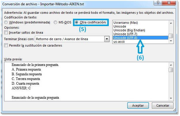 Este evento nos despliega una nueva ventana. Pulsamos sobre (5) “Otra codificación” y bajamos hasta encontrar (6) “Unicode (UTF-8)”. Aceptamos.