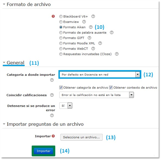 En el apartado Importar preguntas de un archivo, hacemos clic en “Seleccione un archivo” (13) y seleccionamos el fichero de tipo.txt que hemos creado, el .doc no sirve. Pulsamos Importar (14).
