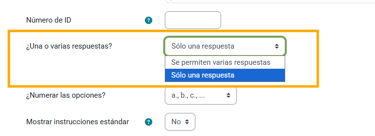 En primer lugar, deberemos sopesar si queremos que la pregunta contenga una o varias respuestas correctas, para lo que elegiremos la correspondiente opción en el desplegable.