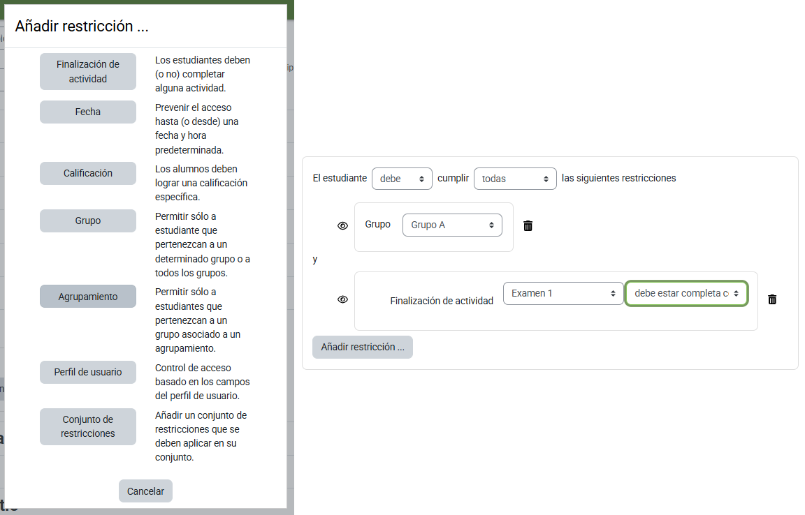 - Grupo y agrupamiento: con esta opción solo podrán acceder las personas pertenecientes a los grupos o agrupamientos que indiquemos.