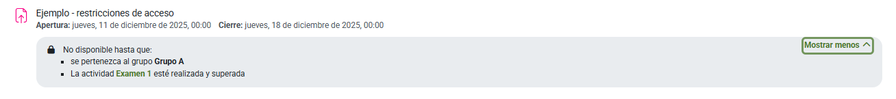 Debemos recordar que la actividad o recurso debe permanecer visible para los estudiantes, puesto que si no, aunque cumplan las condiciones, no podrán acceder a ella. Desde Ajustes comunes del módulo, la opción Disponibilidad debe estar configurada como "Mostrar en la página del curso”. Así, los alumnos verán lo siguiente: