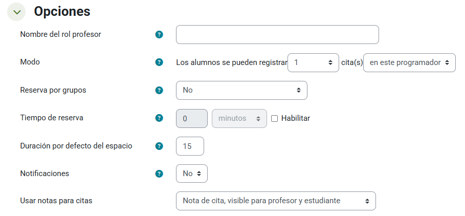 - En el menú Opciones debemos determinar cuántas sesiones podrá reservar cada estudiante y si se permite que lo haga como representante de un grupo, es decir, que cuando un estudiante de un grupo agende una cita, se aplique al resto de integrantes. Además, podremos marcar el tiempo por defecto de la duración de la cita, aunque se podrá cambiar a posteriori en cada una de ellas.