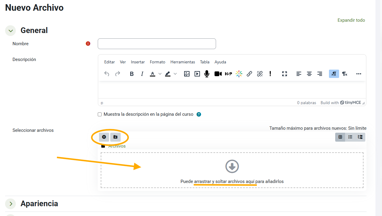 Aunque podemos subir archivos simplemente arrastrándolos desde el Explorador de archivos de nuestro ordenador, es recomendable crear un recurso de tipo Archivo para así configurarlo si nos resulta necesario.