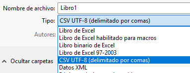 Una vez completo el Excel, debemos guardarlo como archivo CSV de tipo UTF8 delimitado por comas.