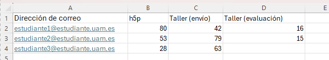 No se debe incluir una última columna para la nota final, puesto que Moodle la calculará automáticamente según las ponderaciones que hayamos configurado.