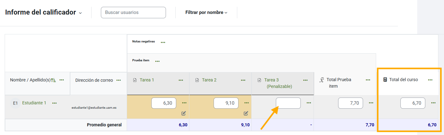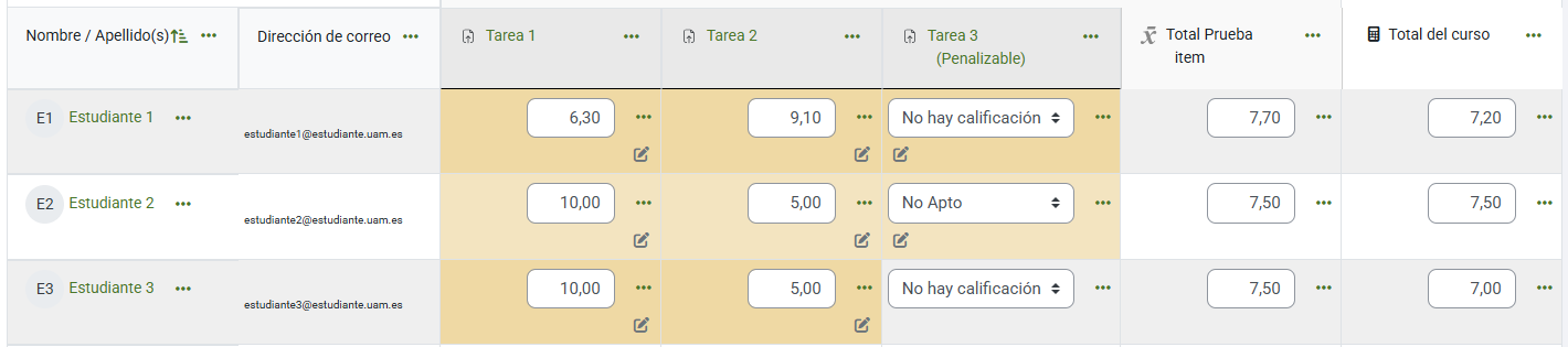 Si se observan las calificaciones del Estudiante 1, podremos ver como al no tener calificación en la Tarea 3, le resta un punto de la nota final.